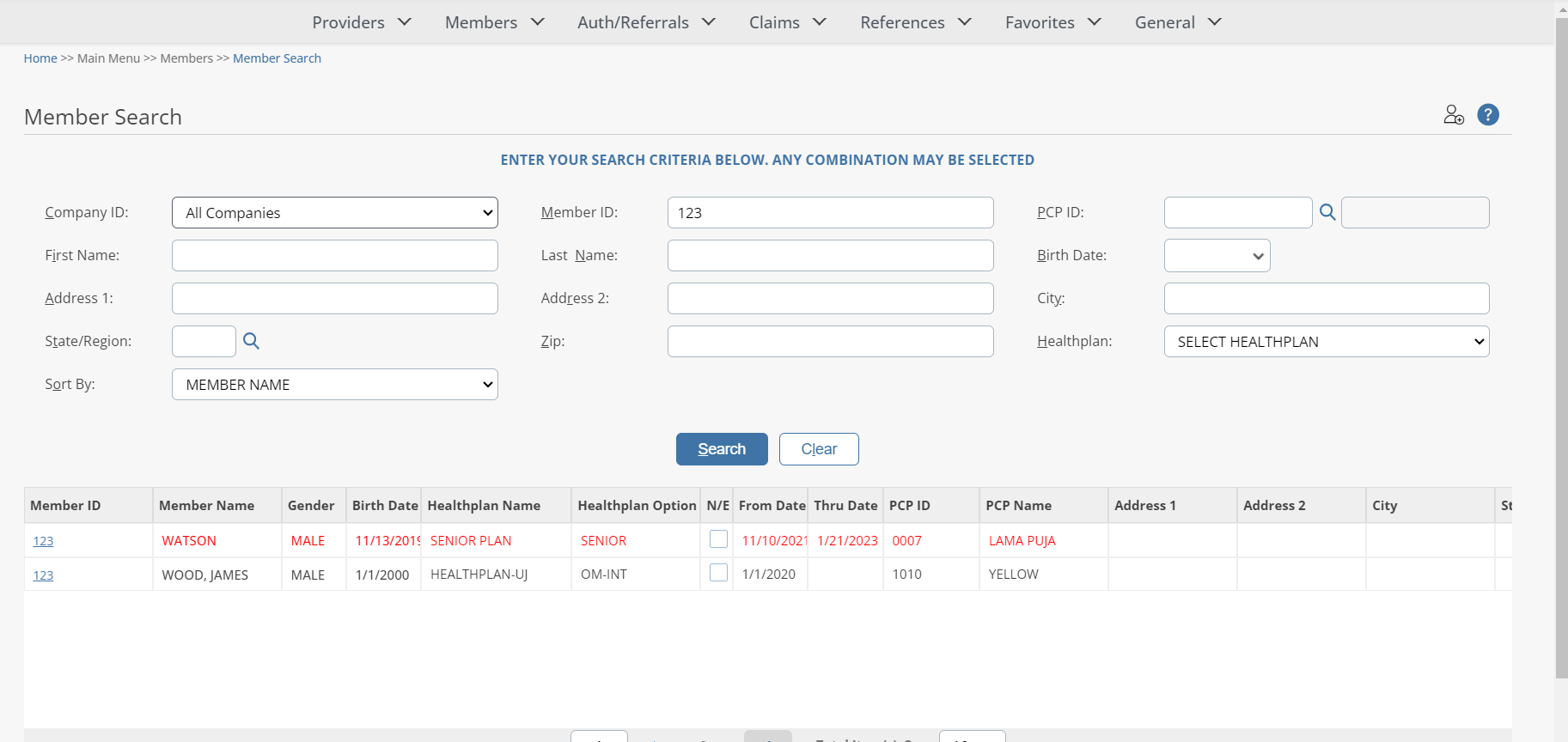 Click on Member Search in the Members section in the Main Menu to search for members.