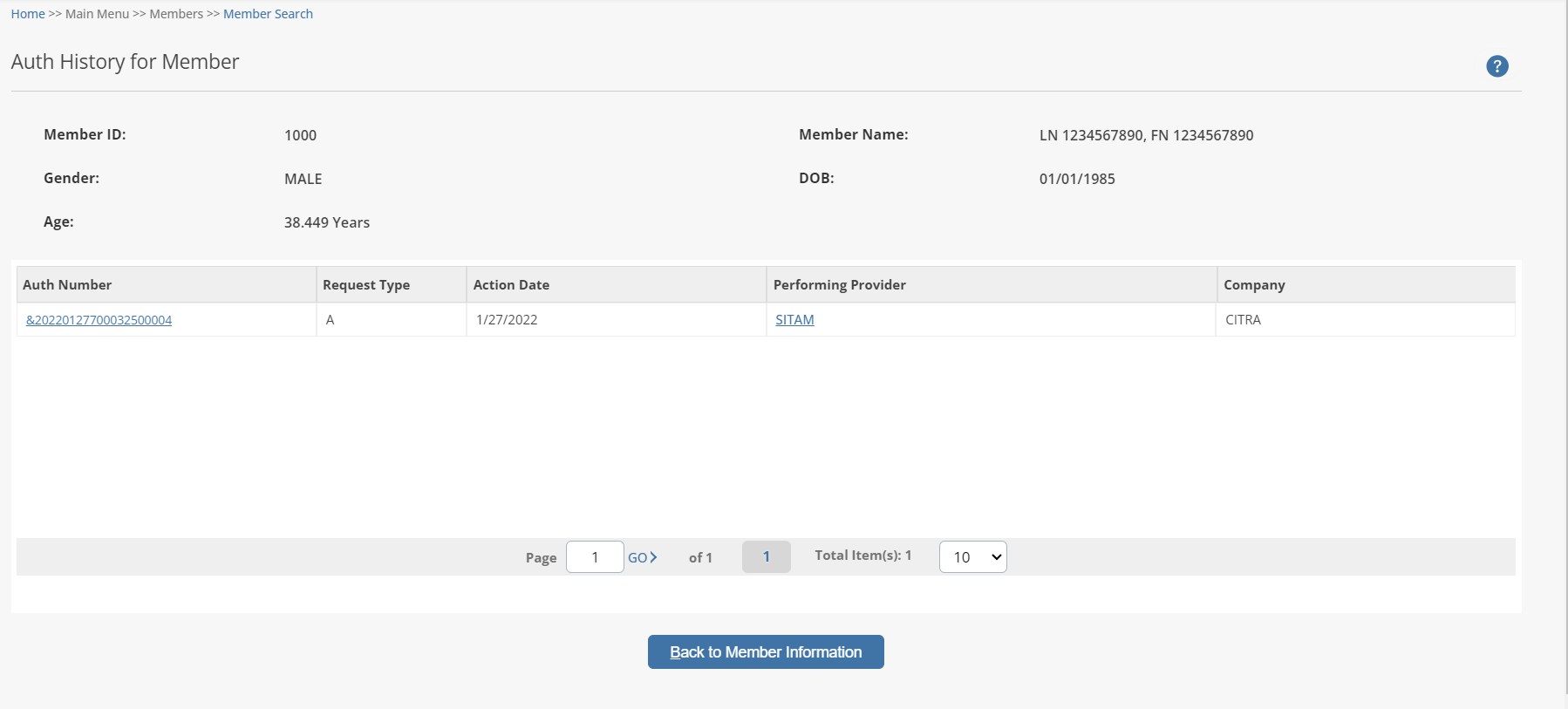 To display member detail, click on a member ID in the “Member ID” column (in BLUE text) within the Member Search Results window. The Notes and Memos are displayed based on the PROVIDER ADMINISTRATION PORTAL Company Configurations.