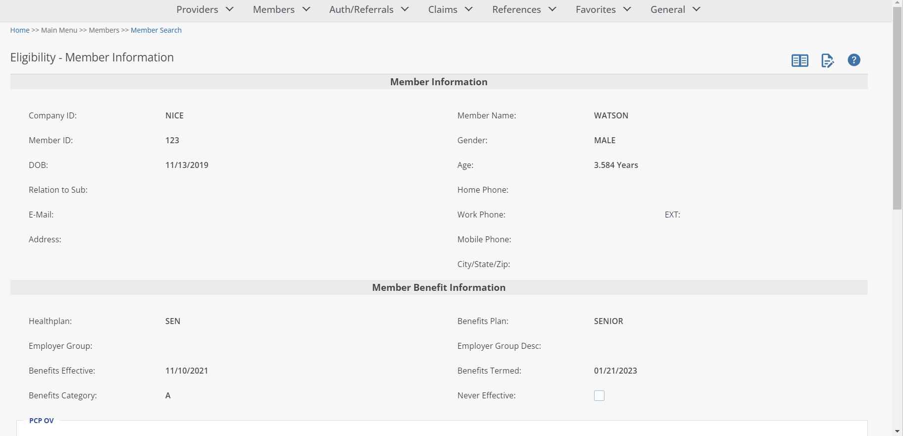 From the Member Information window (previous page), view detail of the member’s PCP by clicking on the PCP Name in red text in the Primary Care Provider Information section to display the Provider Detail window.