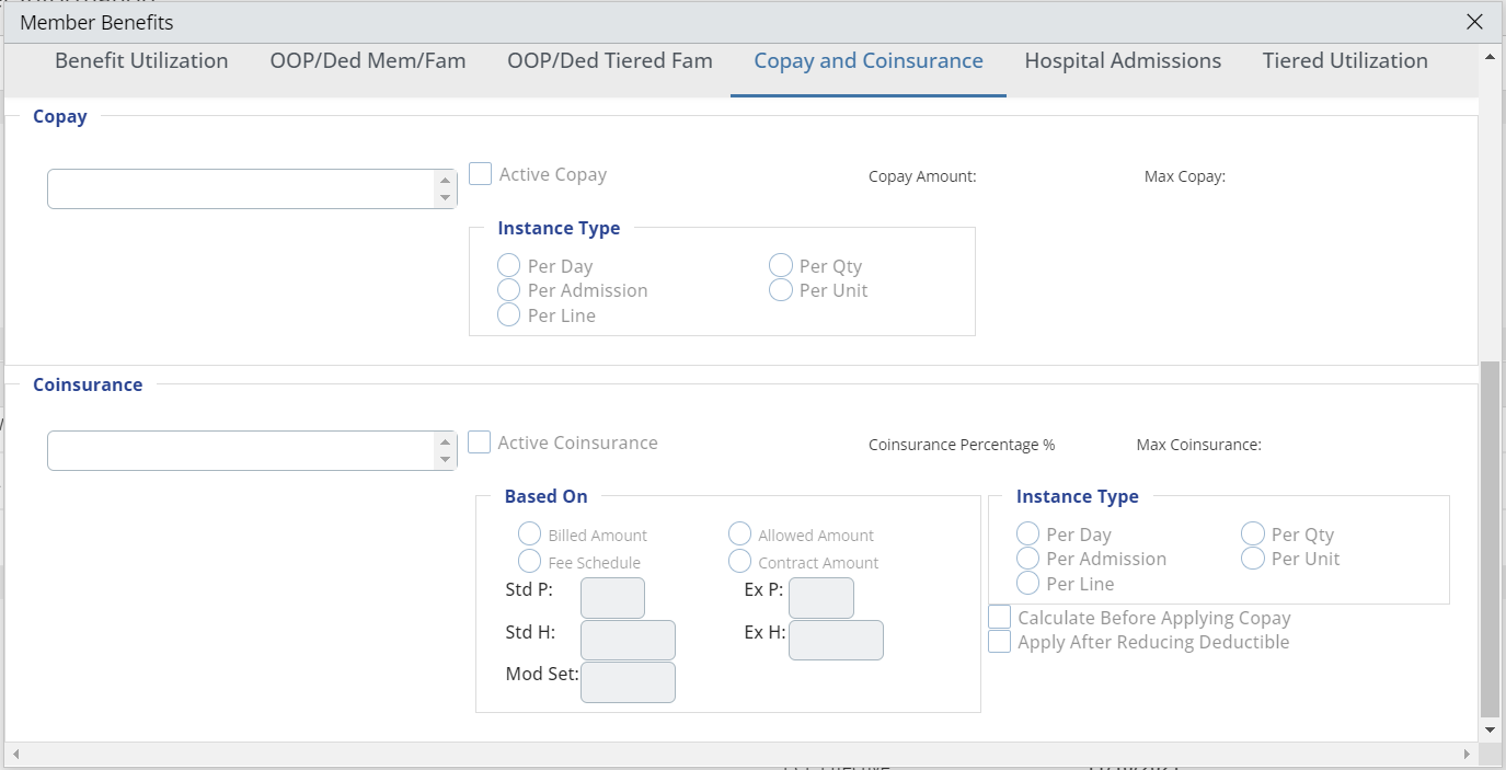 Copay and coinsurance tab on the Member Benefit screen displays Copay and Coinsurance information for the member based on the Health plan and Option code selected.